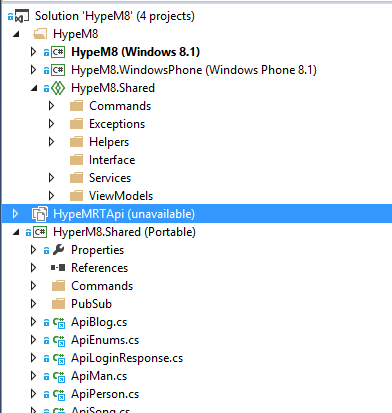 I mentioned earlier that I have a Windows 8.1 Class Library, which implements the HypeM Api. Now in the new SDK we have Universal App - Portable Class library. This is just a PCL which targets Win8.1 and WinPhone 8.1. So I can take advantage of this I needed to move all my stuff over to the new project type.