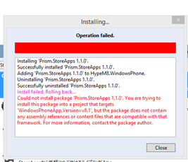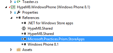 I’d used the Prism for Store Apps package for a number of things in the Win8.1 app. When I tried to add it from Nuget I got some nasty red telling me it wasn’t supported by this project type.