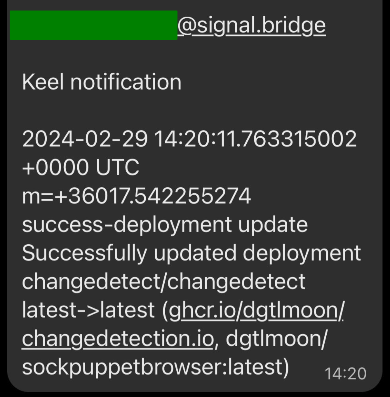 keel.sh/pollSchedule: "@every 1h"As with watchtower I configured keel’s notifications to use the SMTP -> Signal bridge to get notifications of updates going out.