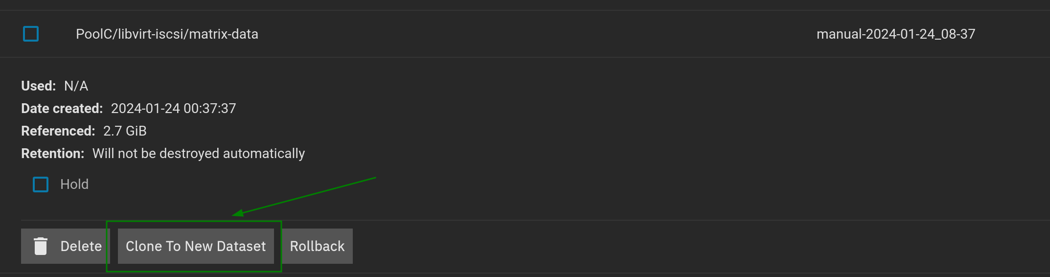 Here I clone a point in time snapshot into a new mountable ISCSI disk
